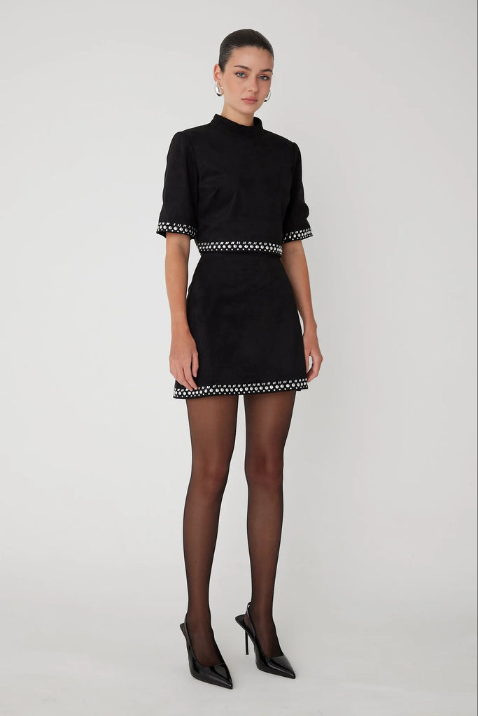 The Zoe set includes two pieces: a mock neck top and an A-line skirt. Both feature silver stud accents along the hems and sleeves, enhancing their elegant silhouette. Crafted from ultra-soft, stretchy black faux suede, this ensemble combines comfort with a refined glamour highlighted by the silver detailing. Sold as a coordinated set.