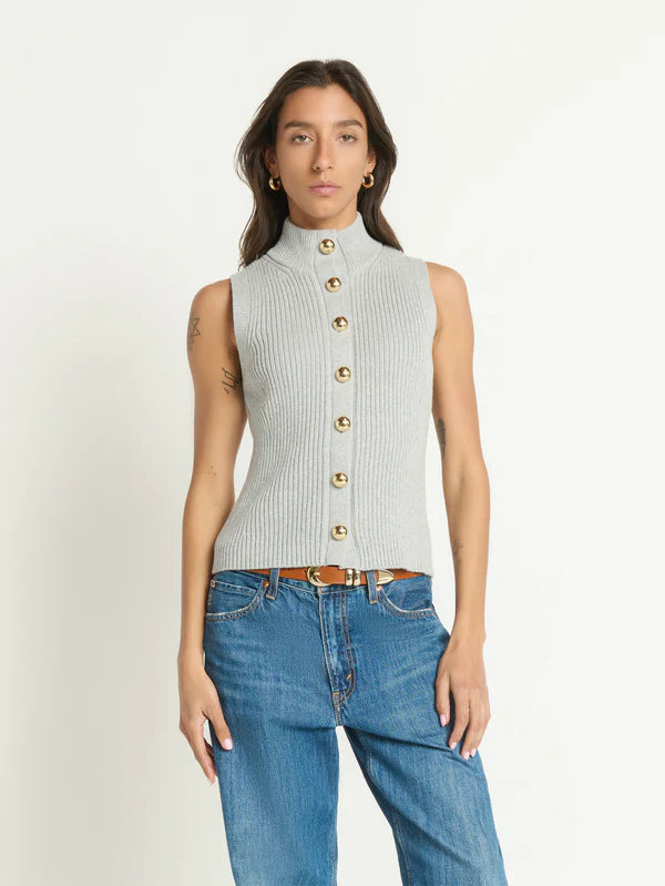 This timeless cotton cashmere sweater vest hits right at the hip and includes details like a mock neck, luxe ribbing, and gold dome buttons. This one comes in Heather Grey.