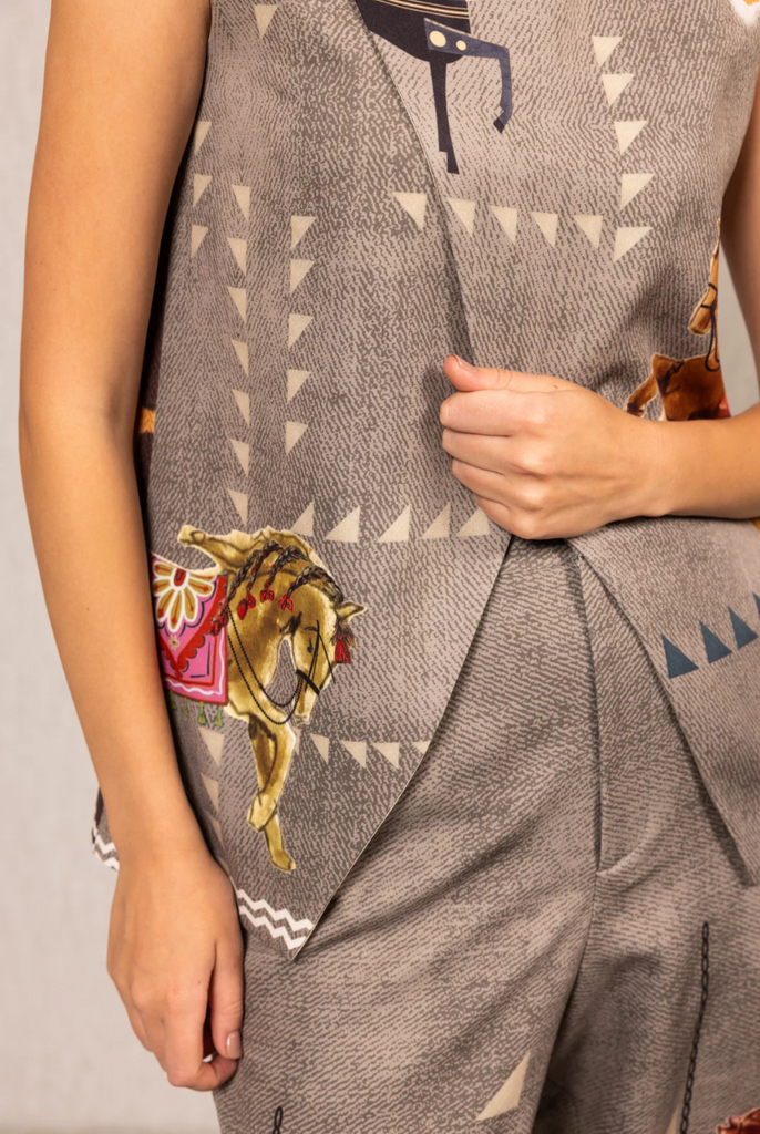 The signature Irish Horse print takes center stage, featuring trotting and galloping horses in ornate saddlery, inspired by Irish equestrian art. Tonal triangles and graphic borders add dimension, making this piece a wearable canvas of movement and color.