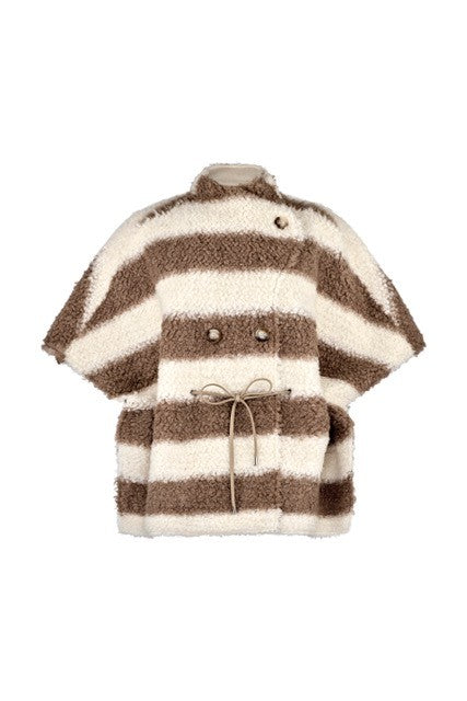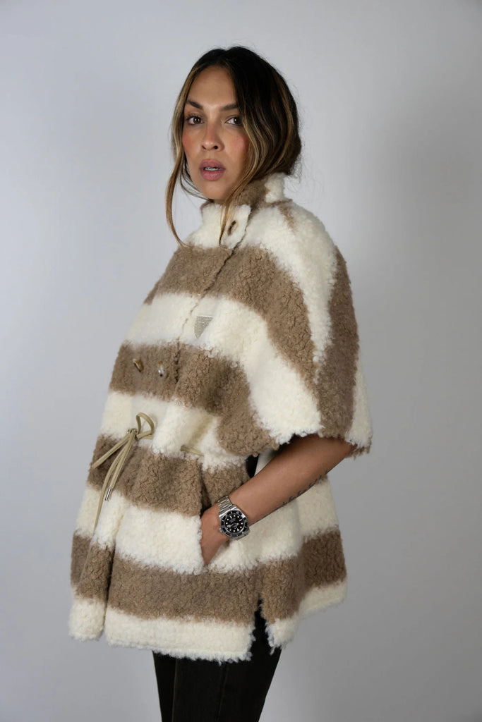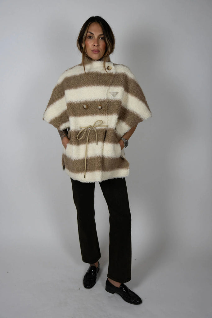 Meet your new signature layer: The Manor Cape in Beige Stripe. A soft, sculptural cape made from a heavyweight textured wool knit that drapes like a dream and styles like a boss. This neutral-toned stunner features wide horizontal beige and white stripes, blending statement with subtlety for the seriously cool girl who’s always ahead of the curve.